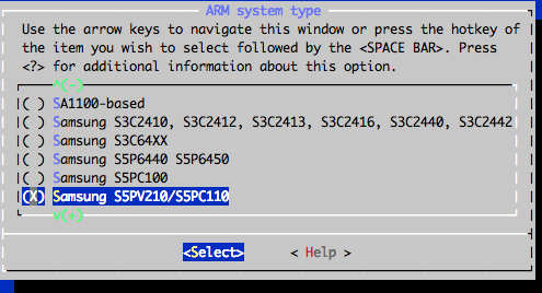 System Type → ARM system type 으로 들어가 아키텍쳐를 s5pv210 으로 설정합니다.